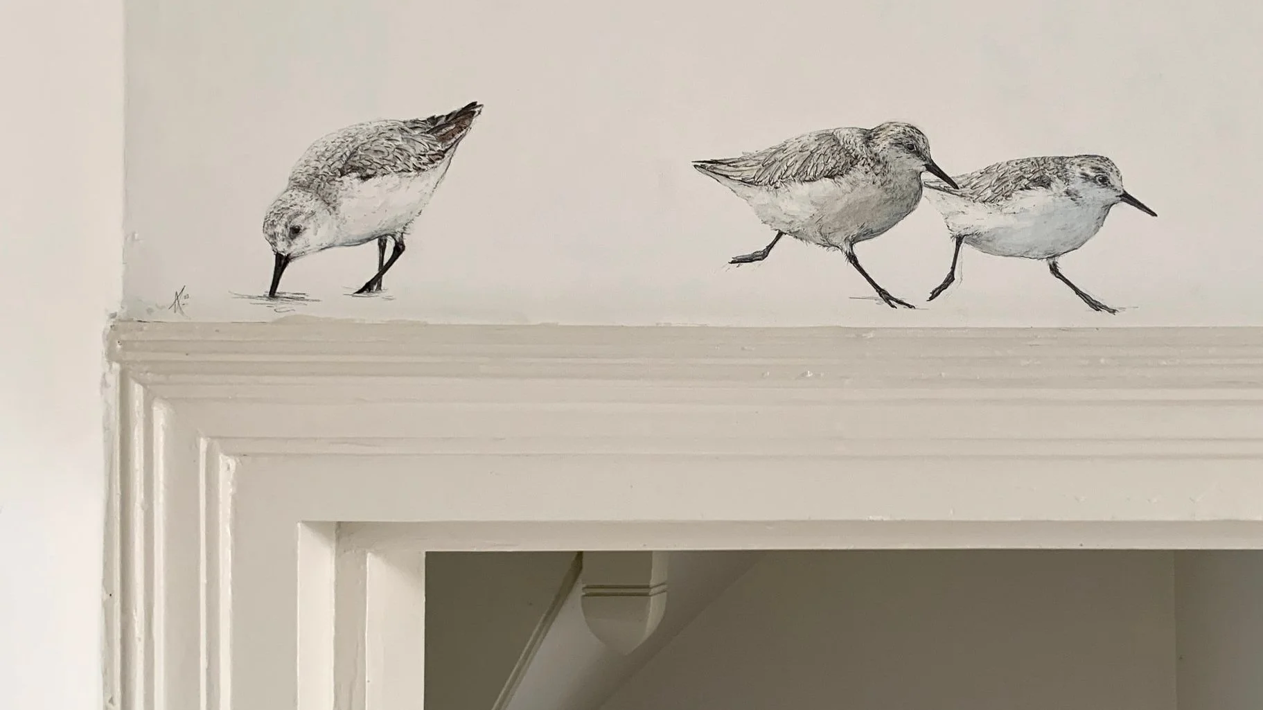 Wandmalerei mit Sanderlingen (Calidris alba) und Säbelschnäbler (Recurvirostra avosetta).2023.Bleistift und Pigmente.